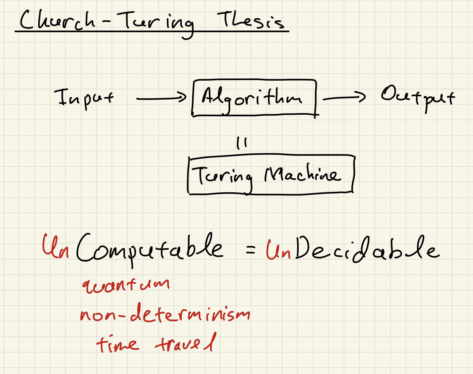 Before we go further, let us clarify what we mean by computable. The Church-Turing Thesis is equivalent to the statement that every computable problem can be solved by a Turing machine. Moreover, we expect that a computational process should always complete in finite time and not run forever. Thus, we will use decidable to mean computable and consequently, undecidable problems are uncomputable.